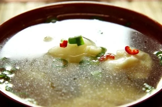 ШАГ 2 Замесить тесто из муки, воды и яиц, добавить соль. Раскатать тонкие лепешки и отварить в бульоне.