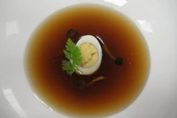 ШАГ 10 Посолить, попробовать, убедиться, что все в порядке, и процедить через мелкое сито и двухслойную марлю. На выходе получается жидкость цвета некрепкого кофе. Консоме разлить в чашки и подавать.