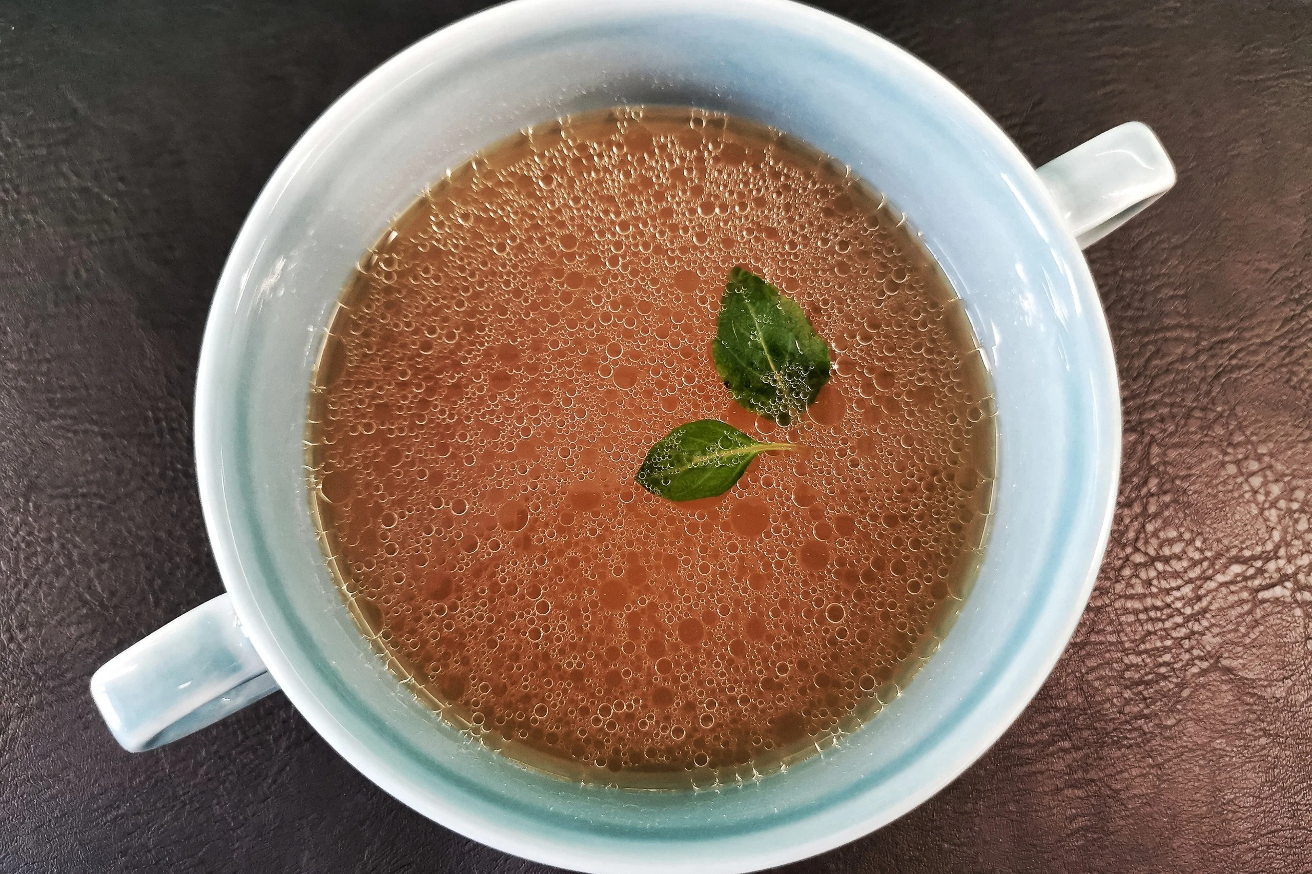 ШАГ 11 Посолить бульон по вкусу, процедить. Перелить в глубокую миску, украсить листиком зелени и подавать.