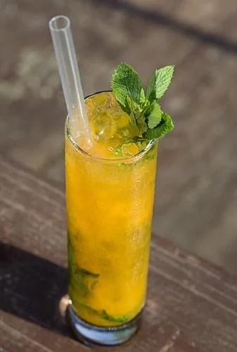 ШАГ 2 Добавьте яблочный газированный сок, сок манго, лед и листья мяты. Сразу подавайте.