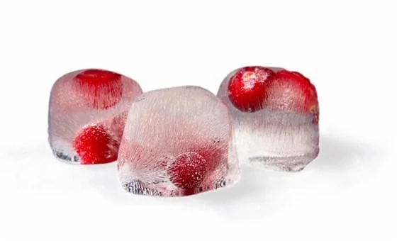 ШАГ 1 Разложите по несколько ягод в формочки для льда. Смешайте клюквенный сок и воду и залейте ягоды. Поставьте в морозилку на 4 часа до застывания.