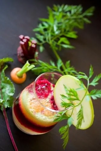 ШАГ 2 Под носик соковижималки подставить стакан, выжать сок из части моркови, затем свеклы поверх морковного слоя, затем из части яблока.