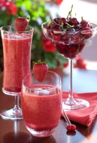 ШАГ 1 В блендере смешайте половину вишни, клубники и сока. Взбейте до состояния пюре и перелейте в бокалы.