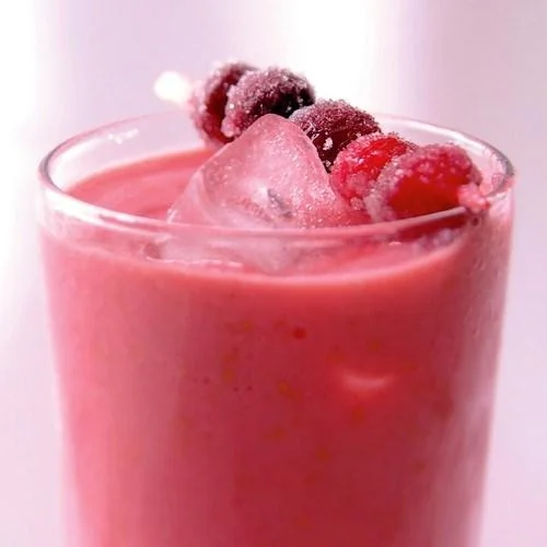 ШАГ 1 В блендере смешайте очищенный и нарезанный кусочками банан, клюкву, молоко и лед. Взбейте до однородного состояния и сразу подавайте.