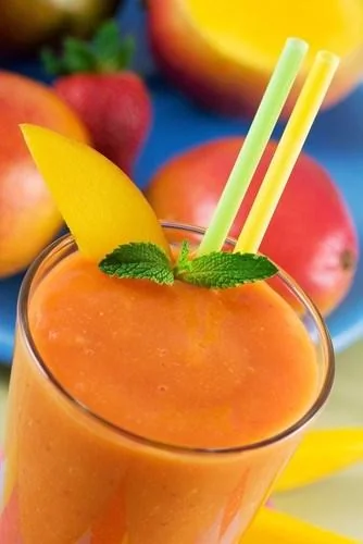 ШАГ 2 Из моркови, манго, апельсина и большой полоски цедры выжмите сок. Сразу подавайте, по желанию добавив лед.