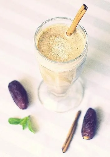ШАГ 2 Полученное молоко процедите через марлю или сито. Добавьте финики, корицу, листья мяты и еще раз смешайте все ингредиенты блендером.