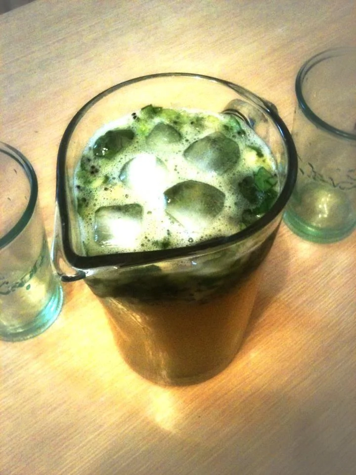 ШАГ 2 В емкость нарезать средними кольцами киви, листья базилика порвать вручную, влить сахарный сироп. Толкушкой, слегка разминая (но не «в кашу»), перемешать. Добавить сок лайма и ром. Перемешать еще раз.