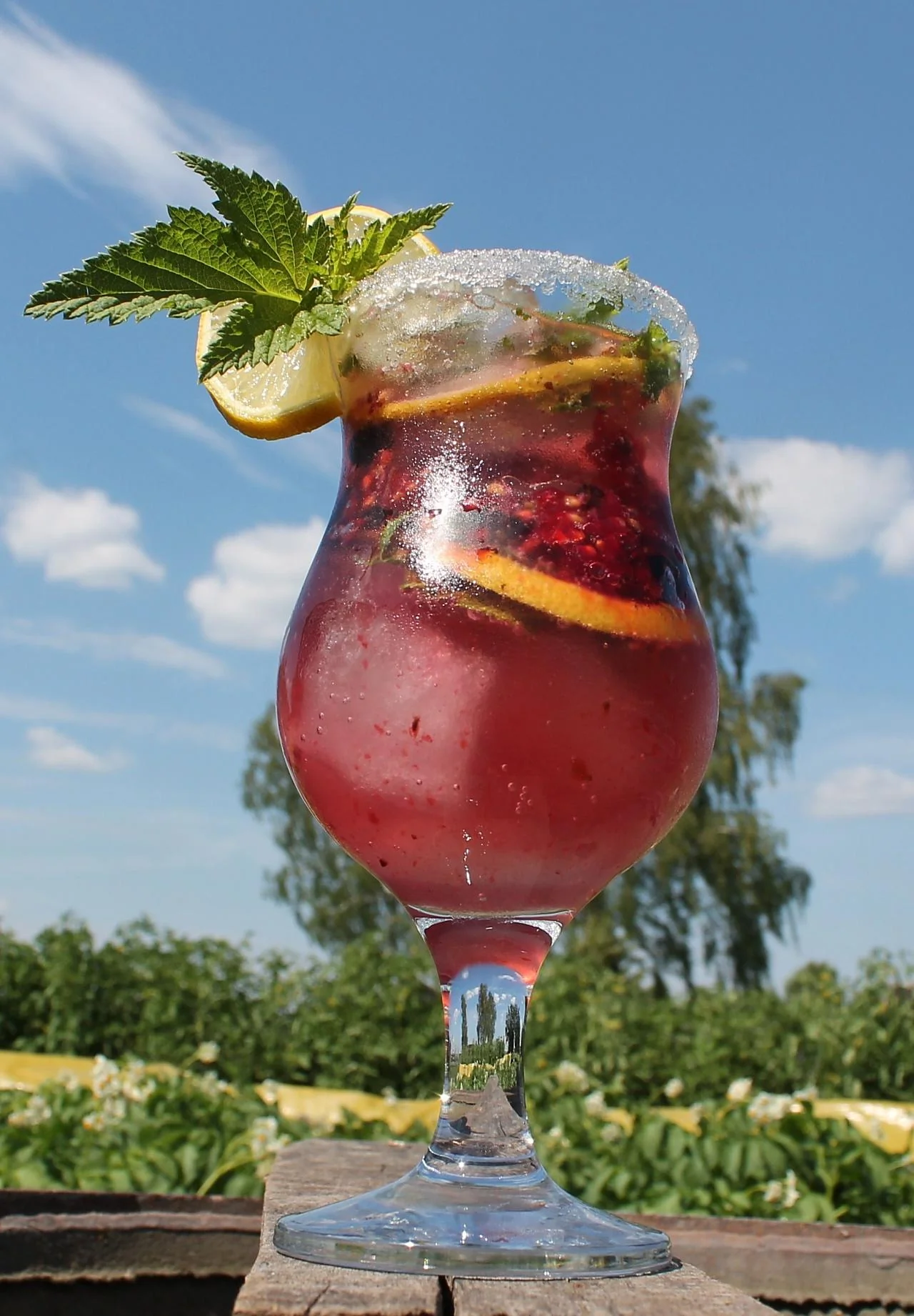 ШАГ 4 Поверх смородины в бокал выкладываем смесь лимона и листьев (мята+смородиновый лист).