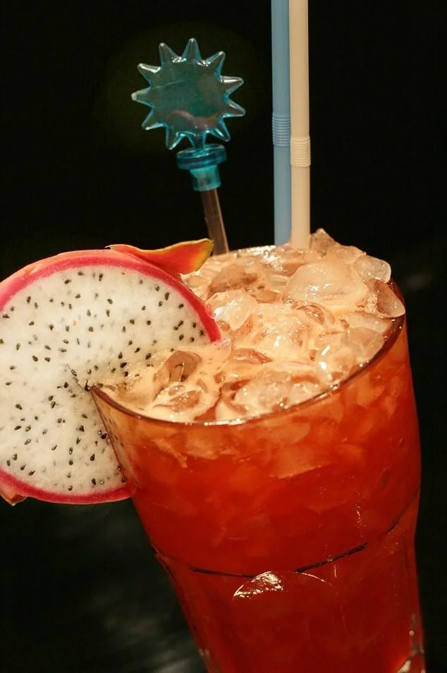 ШАГ 2 Наливаем в шейкер: гренадин, апельсиновый сок, ананасовый сок, вишневый ликер, абрикосовый ликер, золотой ром, темный ром и белый ром.