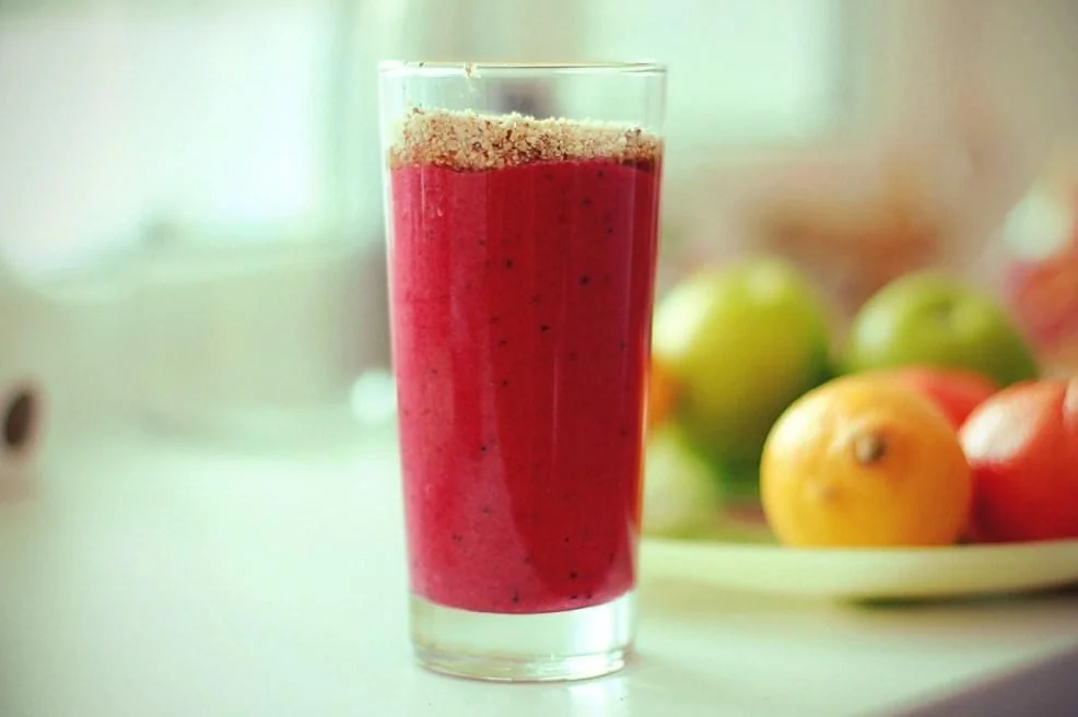 ШАГ 3 Вылить смузи в стакан, вмешать мед, посыпать орехами, перемешать.