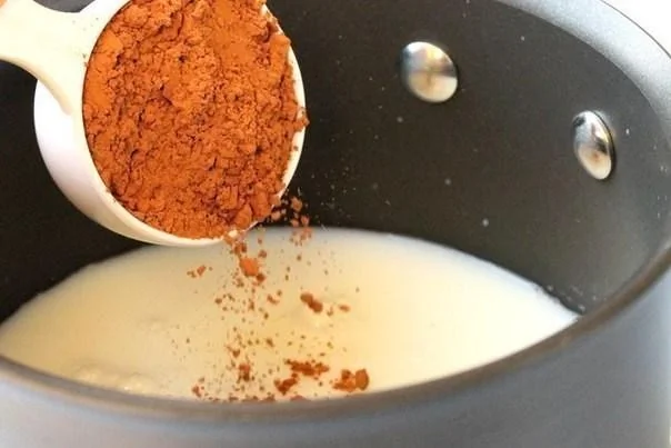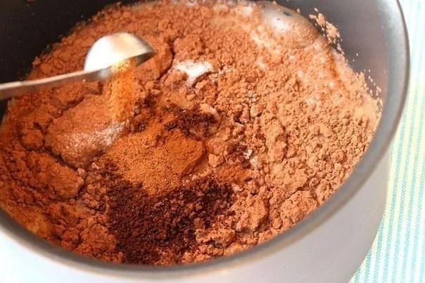 ШАГ 2 Добавьте какао-порошок. Добавьте сахар. Добавьте кофе. Всыпьте корицу и мускатный орех. Добавьте сок 3 мандаринов.