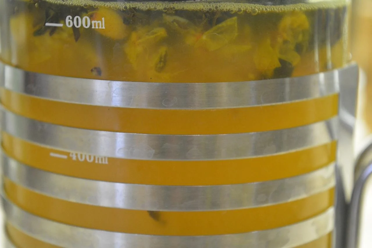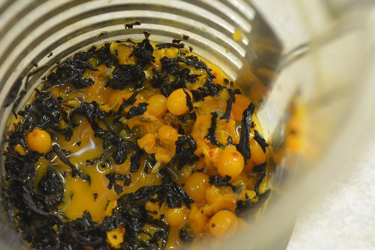 ШАГ 3 Выкладываем облепиховое пюре в чайник, добавляем оставшиеся целые ягоды и черный чай.