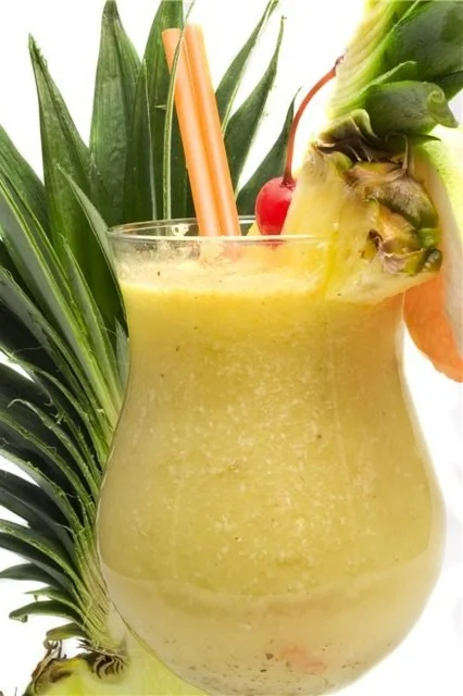 ШАГ 1 В блендере смешайте крупно нарезанные бананы, ром белый, ликер, ананасовый сок.
