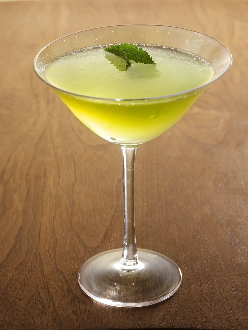 ШАГ 2 Перелить через стрейнер в охлажденный бокал. Бросить листик мяты.