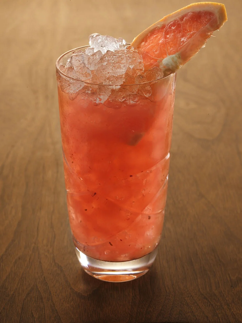 ШАГ 2 Стакан хайбол наполнить колотым льдом и через стрейнер влить коктейль из шейкера. Украсить долькой грейпфрута.