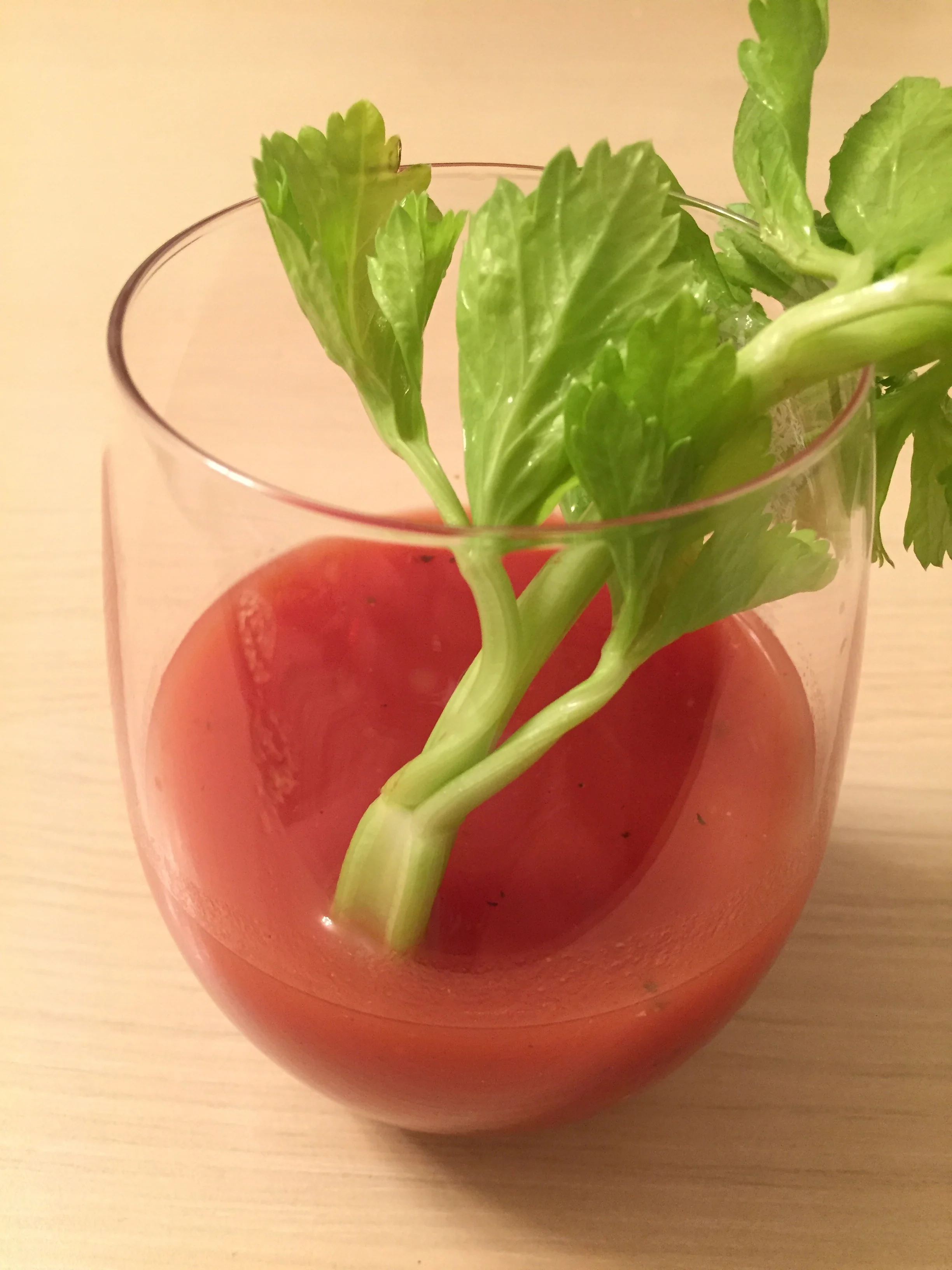 ШАГ 3 Перелить в бокал со льдом, воткнуть заостренный кусочек сельдерея, украсить помидором черри на палочке.