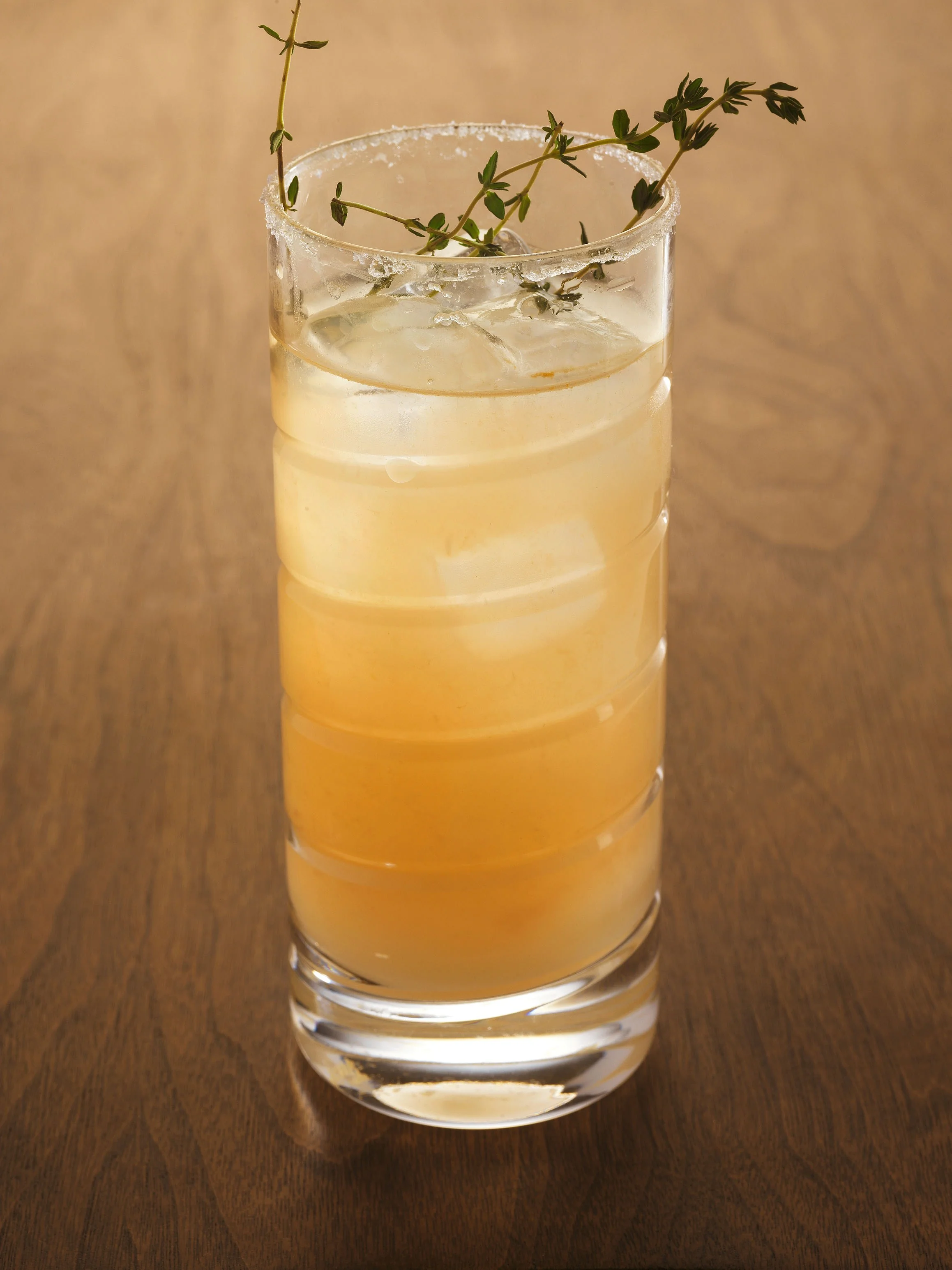 ШАГ 2 Поверх льда налить текилу, сироп и выжать сок половины грейпфрута. Все перемешать, украсить веточками тимьяна и подавать.