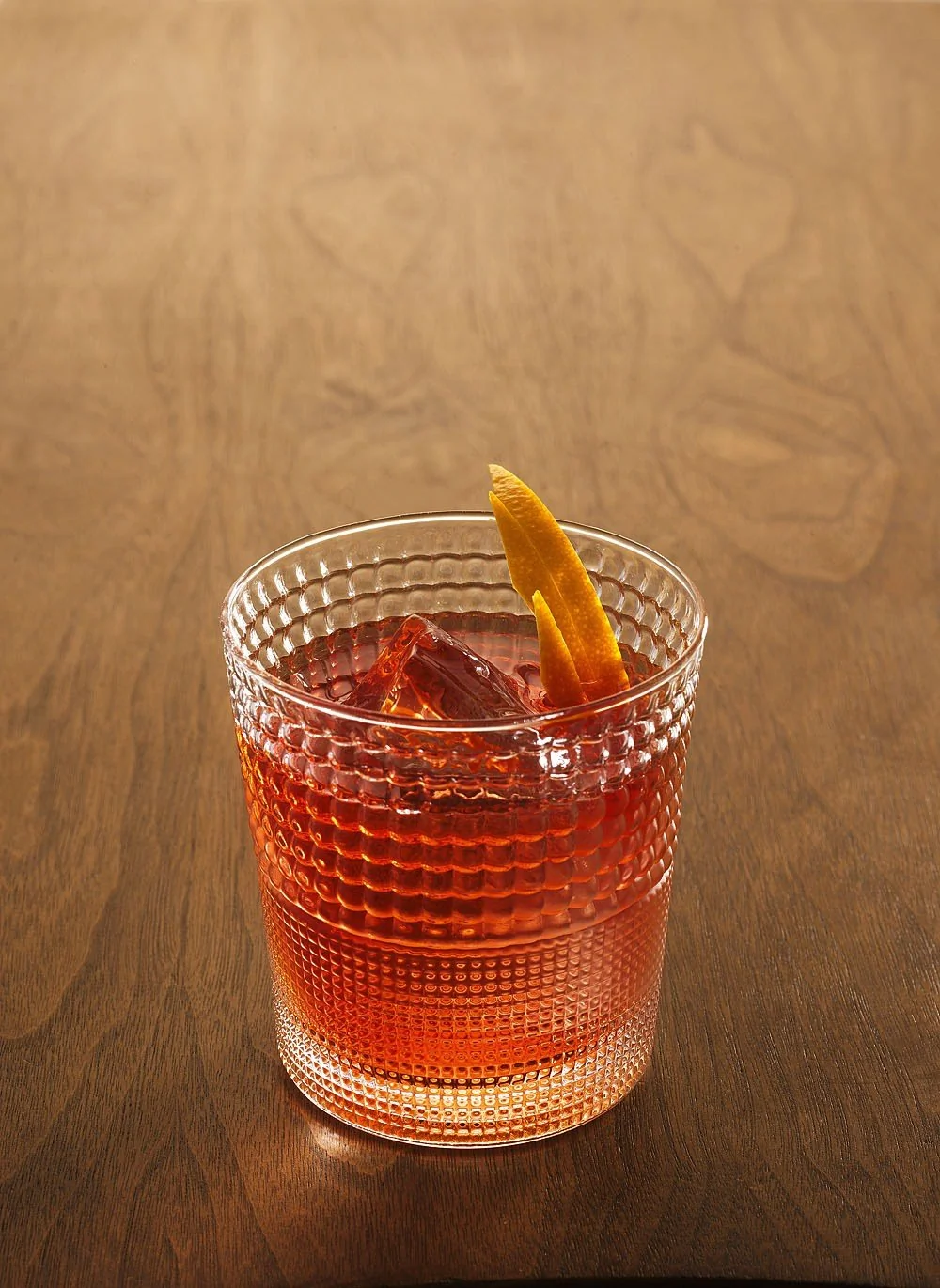 ШАГ 2 Перелить через стрейнер в бокал со льдом. Украсить апельсиновой цедрой.