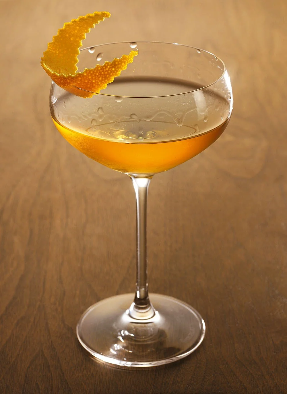 ШАГ 2 Перелить через стрейнер в охлажденный коктейльный бокал. Украсить тонкой полоской апельсиновой цедры.