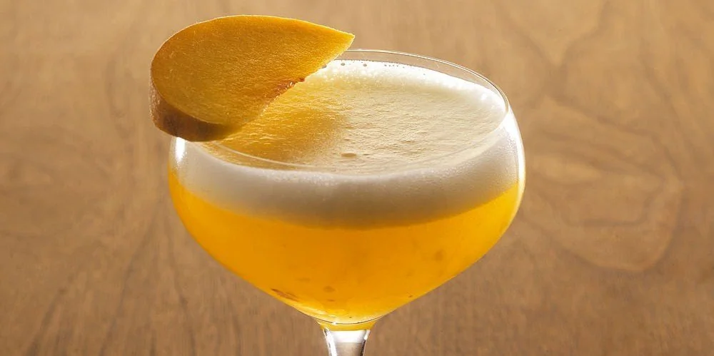 ШАГ 2 Перелить через стрейнер в охлажденный коктейльный бокал. Украсить долькой персика.