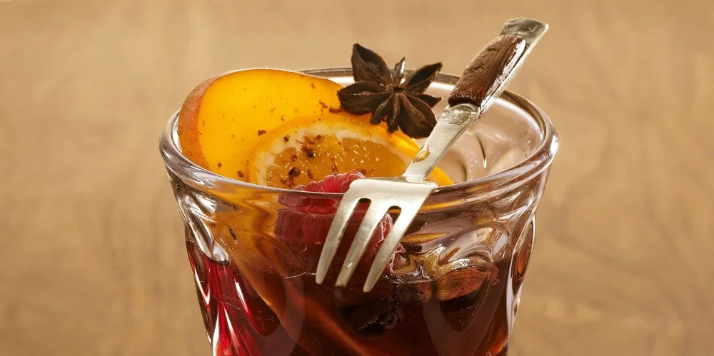 Анис (бадьян) Красное вино Сладкий херес «Педро Хименес» Апельсиновый ликер Оранж биттер Семена кардамона Гвоздика Черный душистый перец Палочки корицы Ванильный сахар Персики Яблоко Апельсины Напитки Европейская кухня Глинтвейн