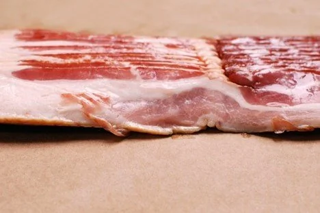 ШАГ 1 Положить полоски бекона в сухую прохладную сковороду. Нагреть сковороду на медленном огне.