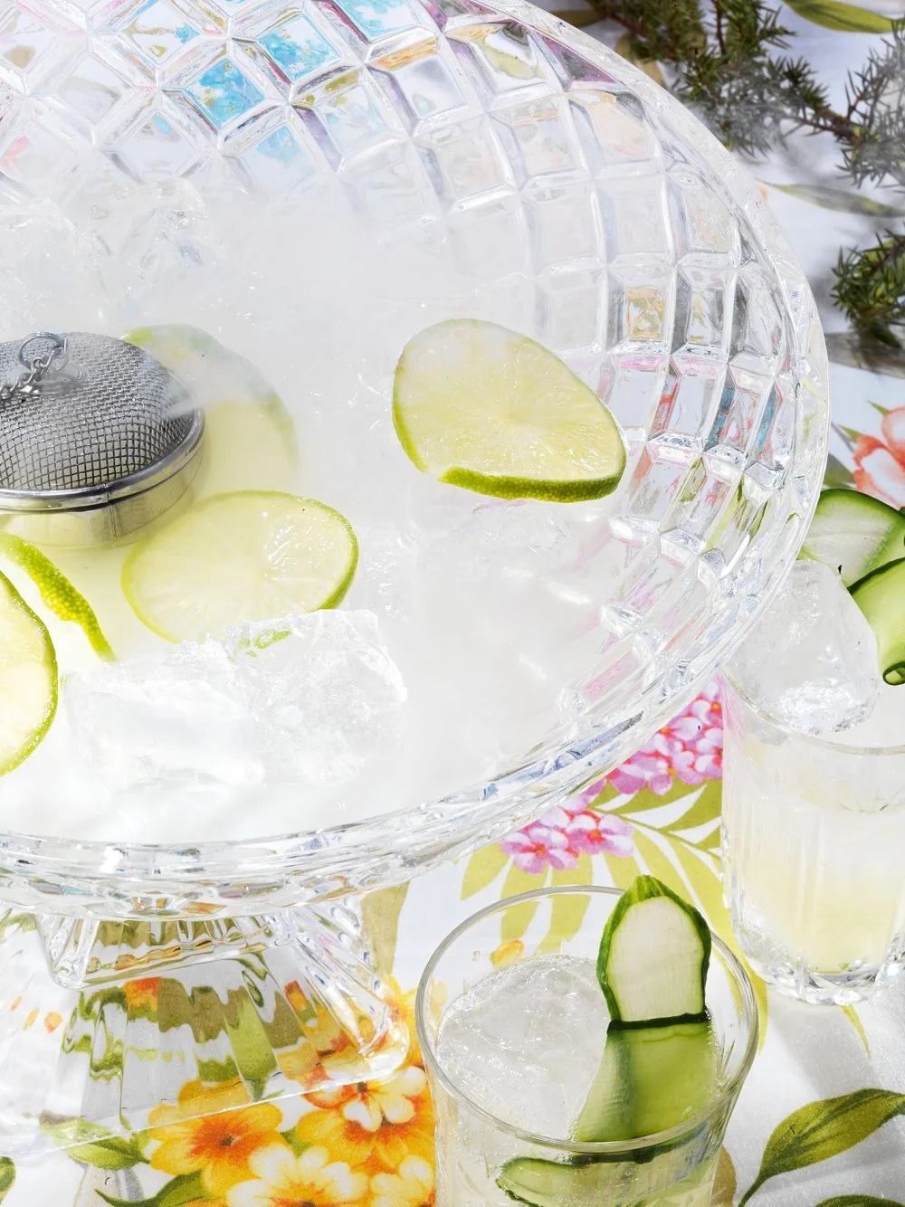 ШАГ 2 В пуншницу с кубиками льда положить нарезанные дольками лайм и огурец (что осталось). Процедить туда же через барное сито коктейль.