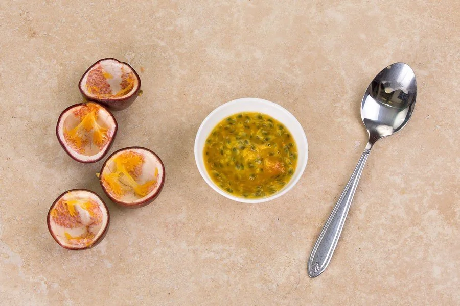 ШАГ 1 Разрежьте плоды маракуйи поперек и вычистите мякоть ложкой.