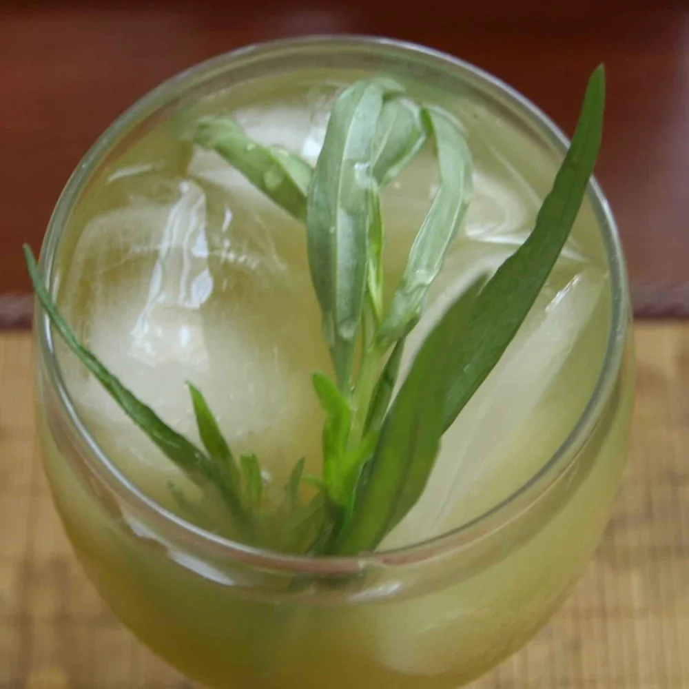 ШАГ 4 Готовый лимонад процедить. В бокал кладем лед, веточку тархуна, наливаем лимонад.