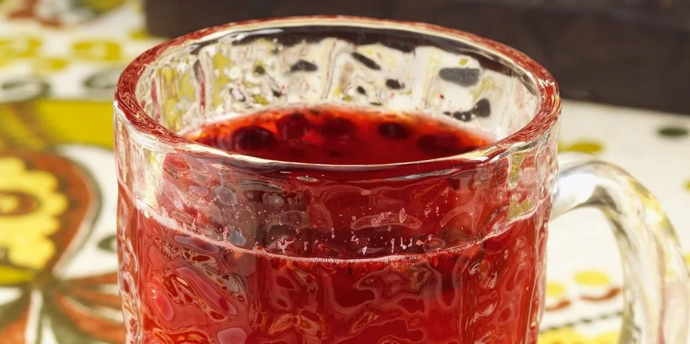 ШАГ 2 Залить ягоды литром кипятка, дать немного постоять и процедить, если нужно, добавить целые ягоды клюквы для красоты и подавать.