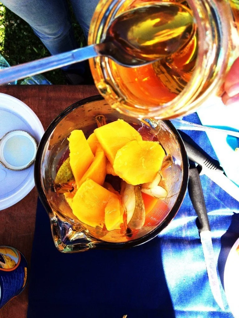 ШАГ 2 Нарезанные ананас, персик, грейпфрут залить морковным соком и добавить мед. Все ингредиенты перемешать в блендере 3–5 минут.