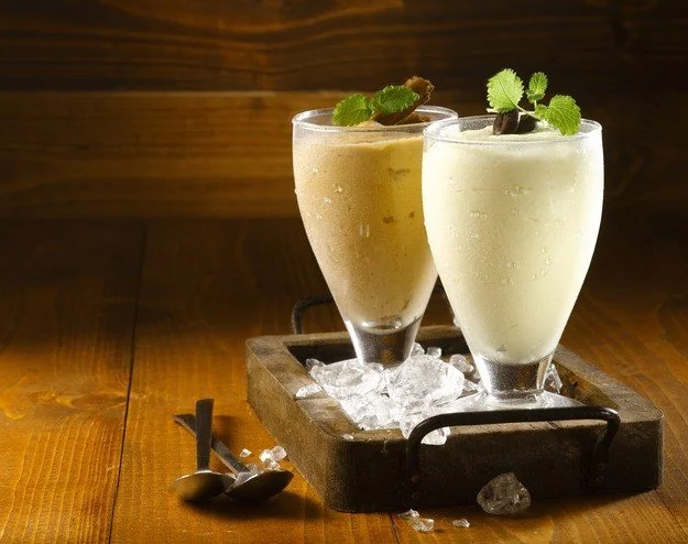 ШАГ 2 После охлаждения добавляем 50 г мороженого, мятный сироп, несколько кубиков льда. Всё взбиваем в блендере.