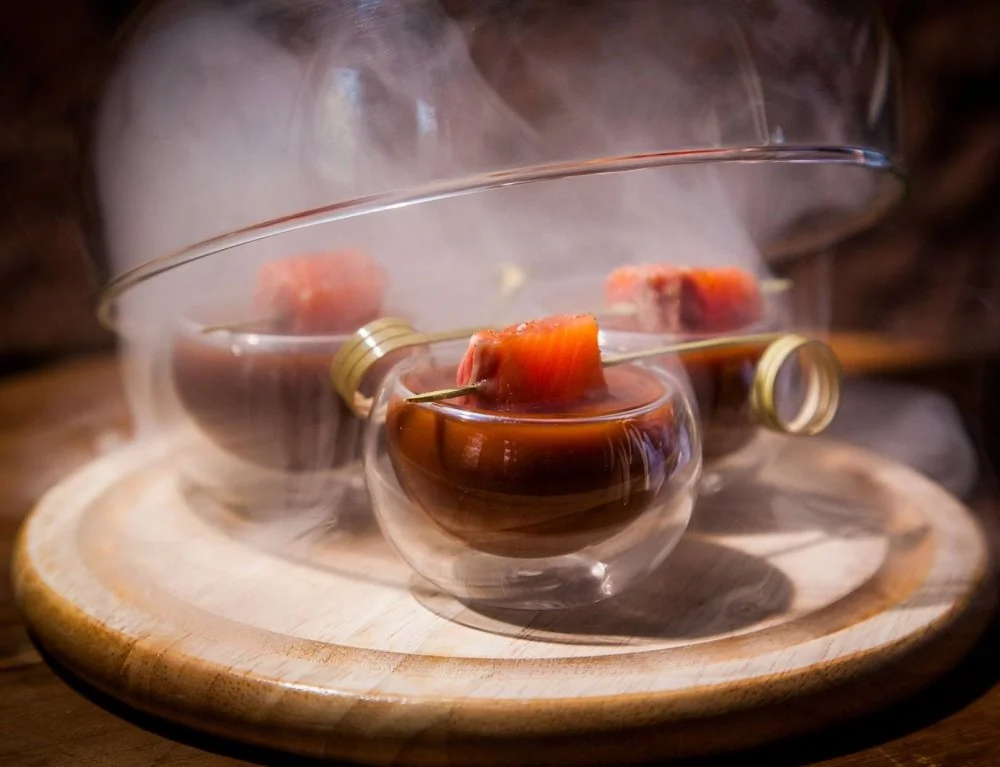ШАГ 4 Подавать коктейль на деревянной подставке в двустенных пиалах под стеклянным клошем. Гарнируется коктейль лососем, маринованным в специальном апельсиново-островато-копченом маринаде в стиле перуанской закуски севиче. Под стеклянный клош нагнетается дым из ольховых щепок, что позволяет сделать крайне эффектную подачу.