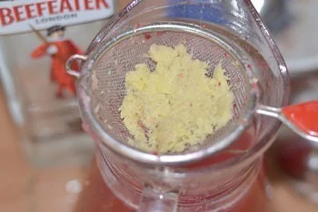 ШАГ 3 Теперь имбирь. Свежий корешок размером 3-4 сантиметра очищаем и трем на терке. Через сито или марлю отжимаем из имбиря сок в клюквенный морс, выжимки имбиря заливаем оставленным кипятком и процеживаем к напитку.