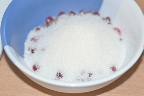 ШАГ 1 Приступим к изготовлению нашего напитка. Клюкву, свежую или размороженную засыпаем сахаром и измельчаем блендером.