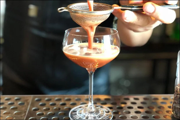 ШАГ 3 Все ингредиенты отправить в шейкер, взбить со льдом и процедить в бокал шале. Украсить сычуаньским перцем сверху.