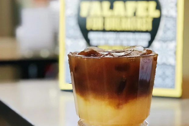 ШАГ 3 В стакан со льдом налить фреш, затем кофе и сироп.
