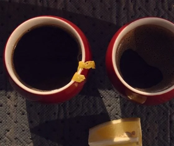 ШАГ 3 С лимонной корки срезать красивые витые стружки. В подогретые чашки разлить кофе, оставляя гущу на дне турки, сверху украсить лимонной цедрой.