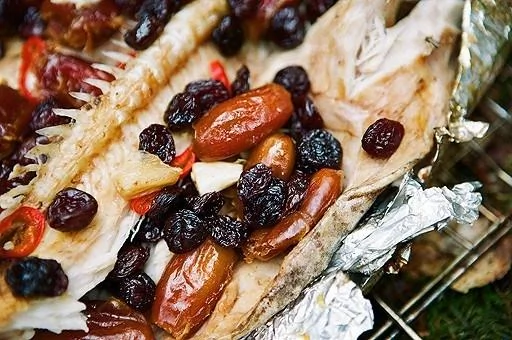 Ингредиенты для приготовления Сом с финиками и изюмом на углях: