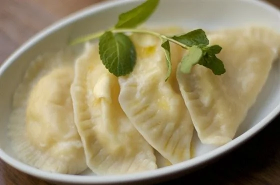 ШАГ 7 Доставать вареники из воды необходимо при помощи ложки с дырками, затем дать стечь излишку воды и выложить на теплую тарелку. Подавать «квери» горячими с кусочком сливочного масла. В сопровождении может выступать сметана или мацони.