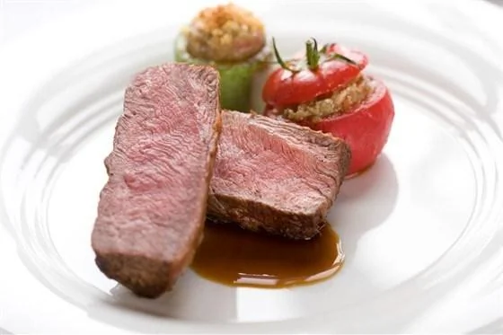 Запеченное филе альпийского ягненка с помидорами и молодыми кабачками, фаршированными баклажанами