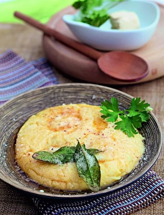 ШАГ 4 На сковороде растопить сливочное масло и обжарить раздавленный зубчик чеснока. Вылить масло в поленту. Украсить блюдо измельченной петрушкой. Для поленты идеально подходят такие сыры как горгонзола и эдамер.