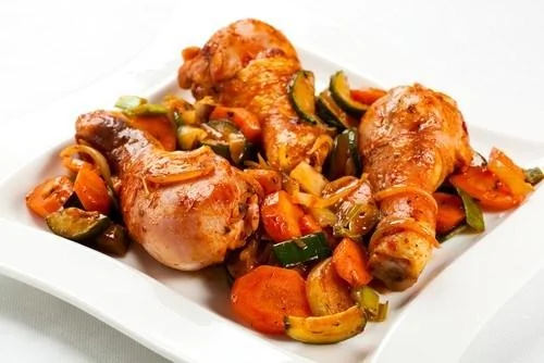 ШАГ 2 Подготовленную курицу разделать на порционные куски, обвалять в муке и обжарить на растительном масле. Добавить обжаренные овощи, потомить 5 минут, затем залить вином, смешанным с бульоном. Посолить, поперчить.