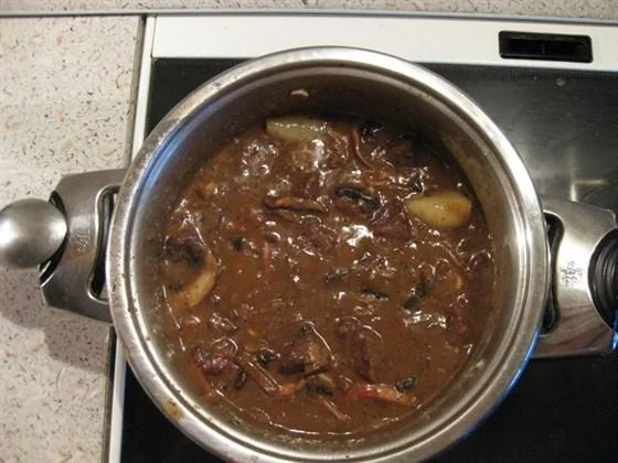 ШАГ 13 Добавляем данную начинку и ложку томатной пасты в соус с мясом, который потушился 2 часа. Перемешиваем, добавляем соль и перец по вкусу, тушим еще 30 минут.