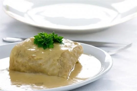 ШАГ 3 Мясо сварить, пропустить через мясорубку, соединить с тушеными овощами, вареным рассыпчатым рисом и рубленой зеленью, хорошо вымешать и, разделив на 2–3 части, завернуть в листья капусты, сложить в кастрюлю, залить сметанным соусом и запечь.