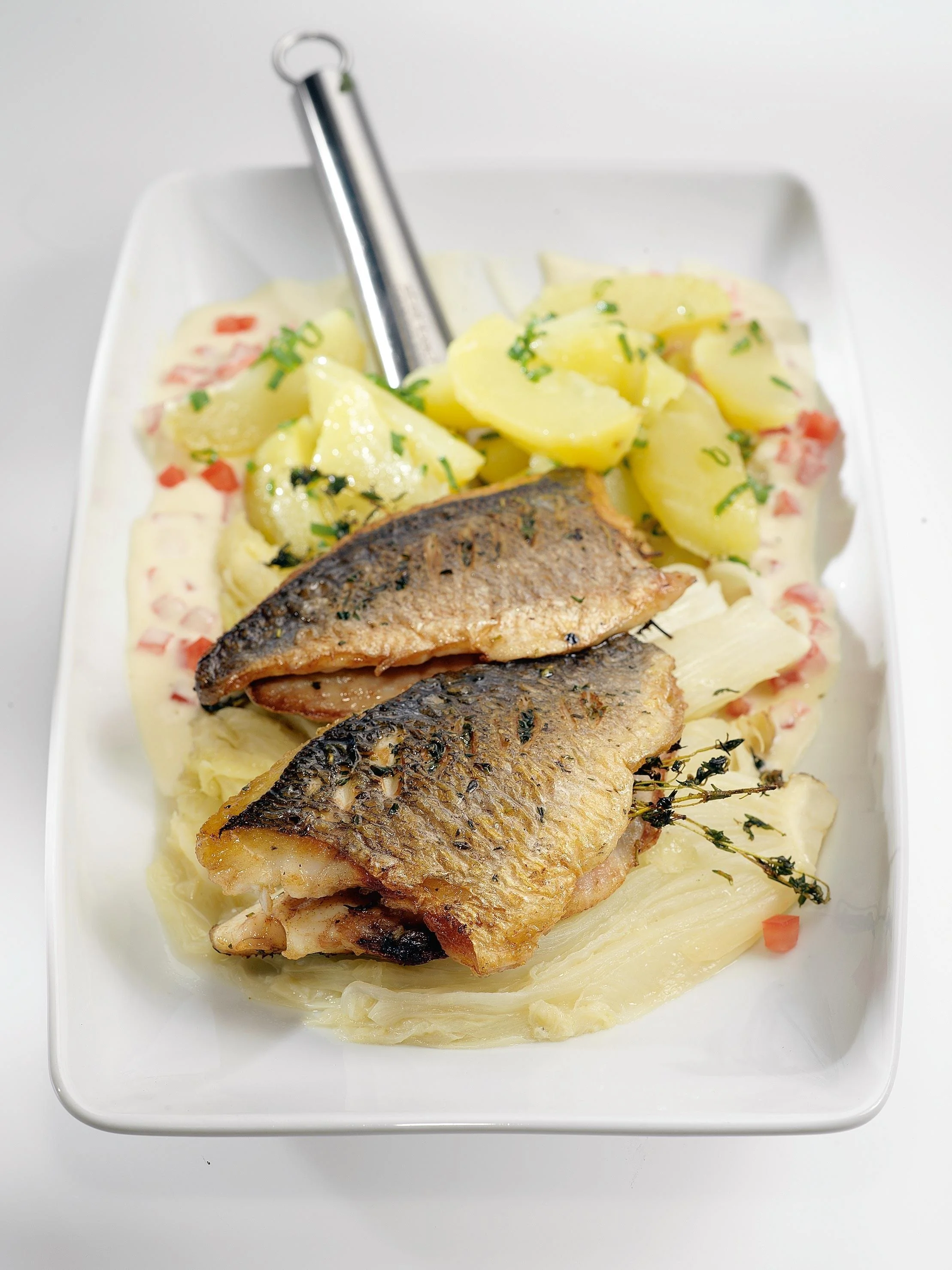 Ингредиенты для приготовления Дорада со сливочно-винным соусом, пекинской капустой и картошкой: