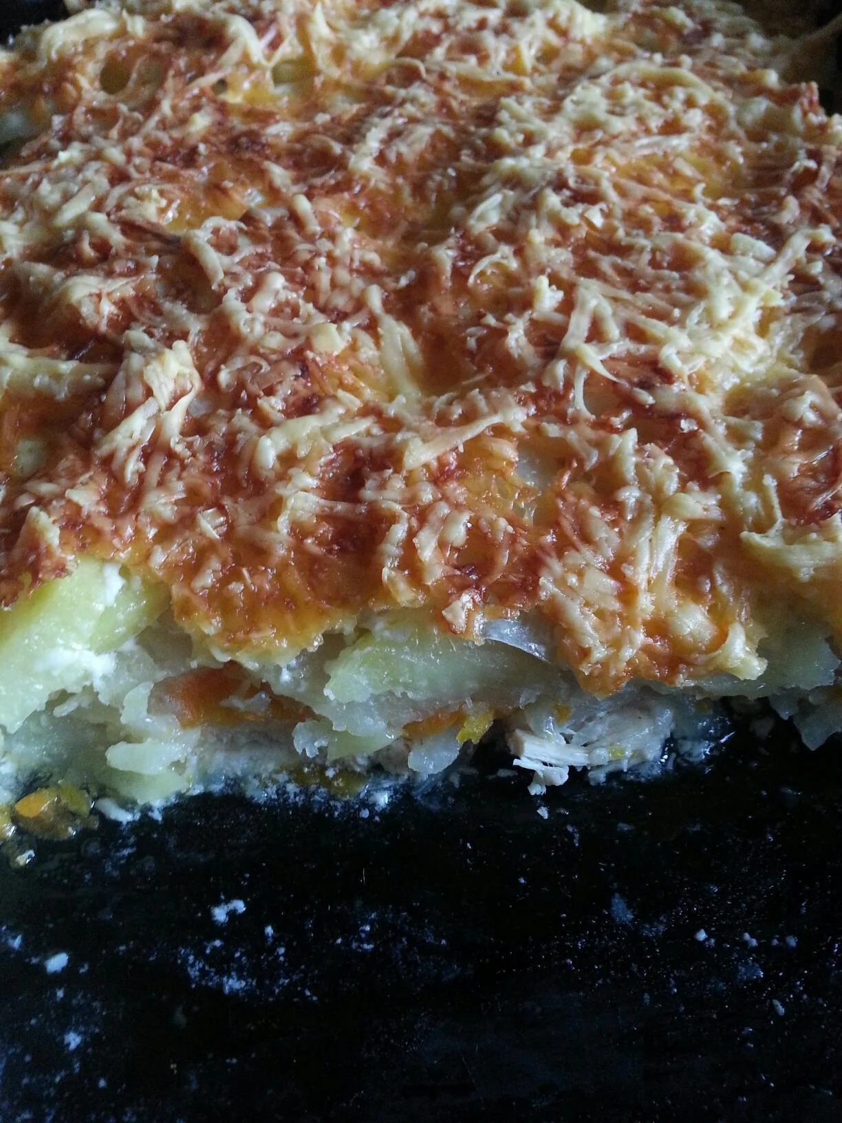 ШАГ 3 Форму для запекания смазать маслом. На дно положить мясо курицы. На курицу выложить лук, на лук положить морковь, на нее — картофель. Посолить, смазать майонезом, посыпать сыром. И отправить в духовку на 30–40 минут при температуре 180 градусов.