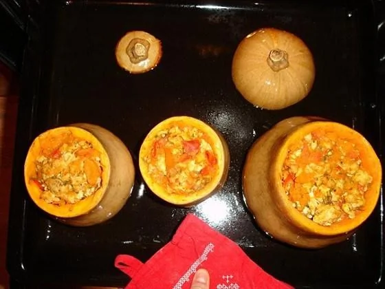 ШАГ 8 Крышечки и фаршированную часть положить на противень отдельно. Вынимаем из духовки и накрываем тыквенной «крышечкой» при подаче на стол.