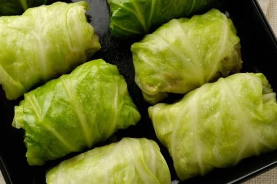 ШАГ 1 Из плотного кочана капусты вырезать кочерыжку и варить кочан до полуготовности, откинуть на сито, дать стечь воде, после чего разобрать капусту на отдельные листы. С каждого листа срезать утолщенные стебли, а листы разложить на доске.