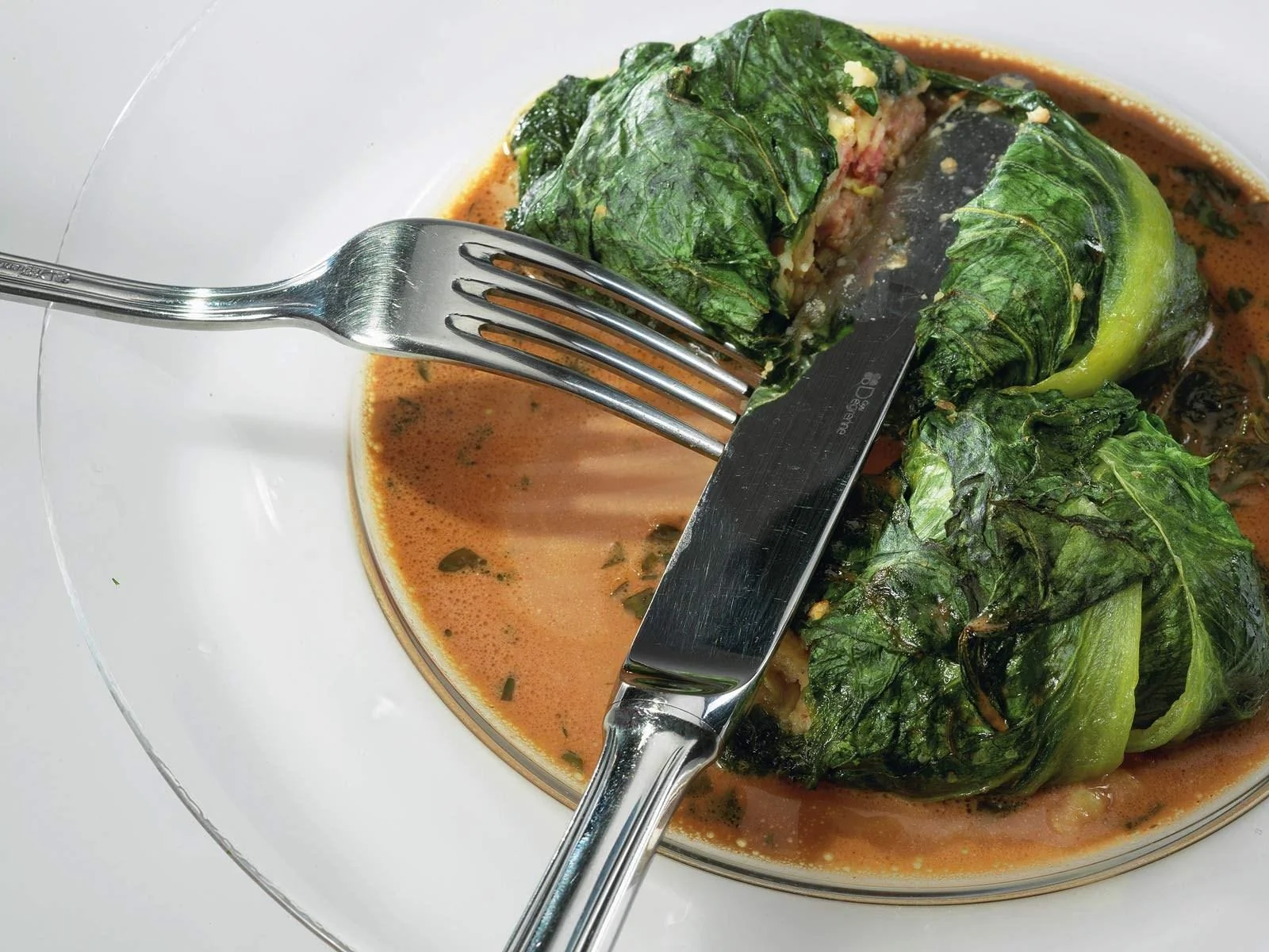 ШАГ 2 Листья салата романо опустить на две минуты в кипящую посоленную воду, после чего остудить и завернуть в них комочки фарша.